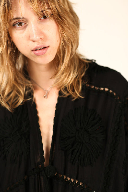BLACK EMBROIDERED KIMONO DUSTER FLORA CROCHET DETAIL