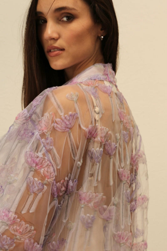 PAN FLOWER EMBROIDERED CHIFFON SILK KIMONO