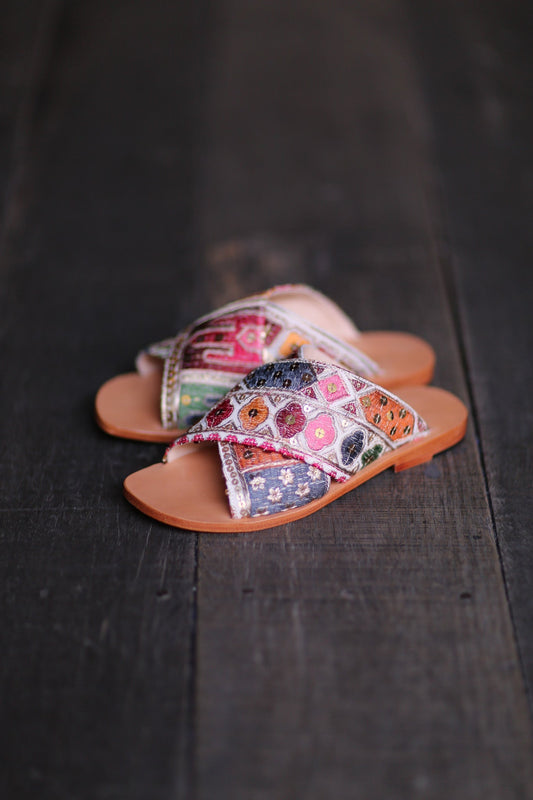 EMBROIDERED LEATHER SLIP ON SANDALS TRIBECA