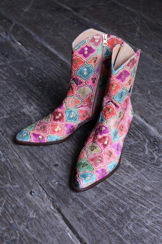 EMBROIDERED VELVET / PINK LEATHER BOOTS DAISY