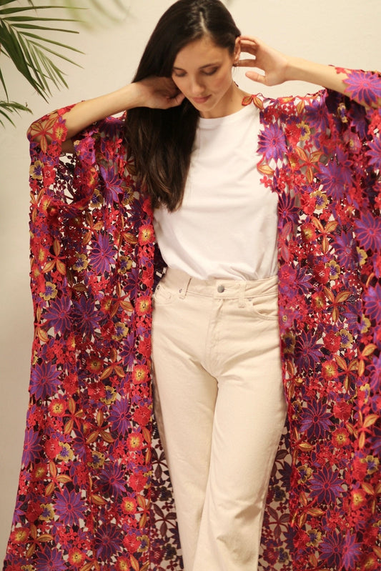 PAN FLOWER EMBROIDERED CHIFFON SILK KIMONO