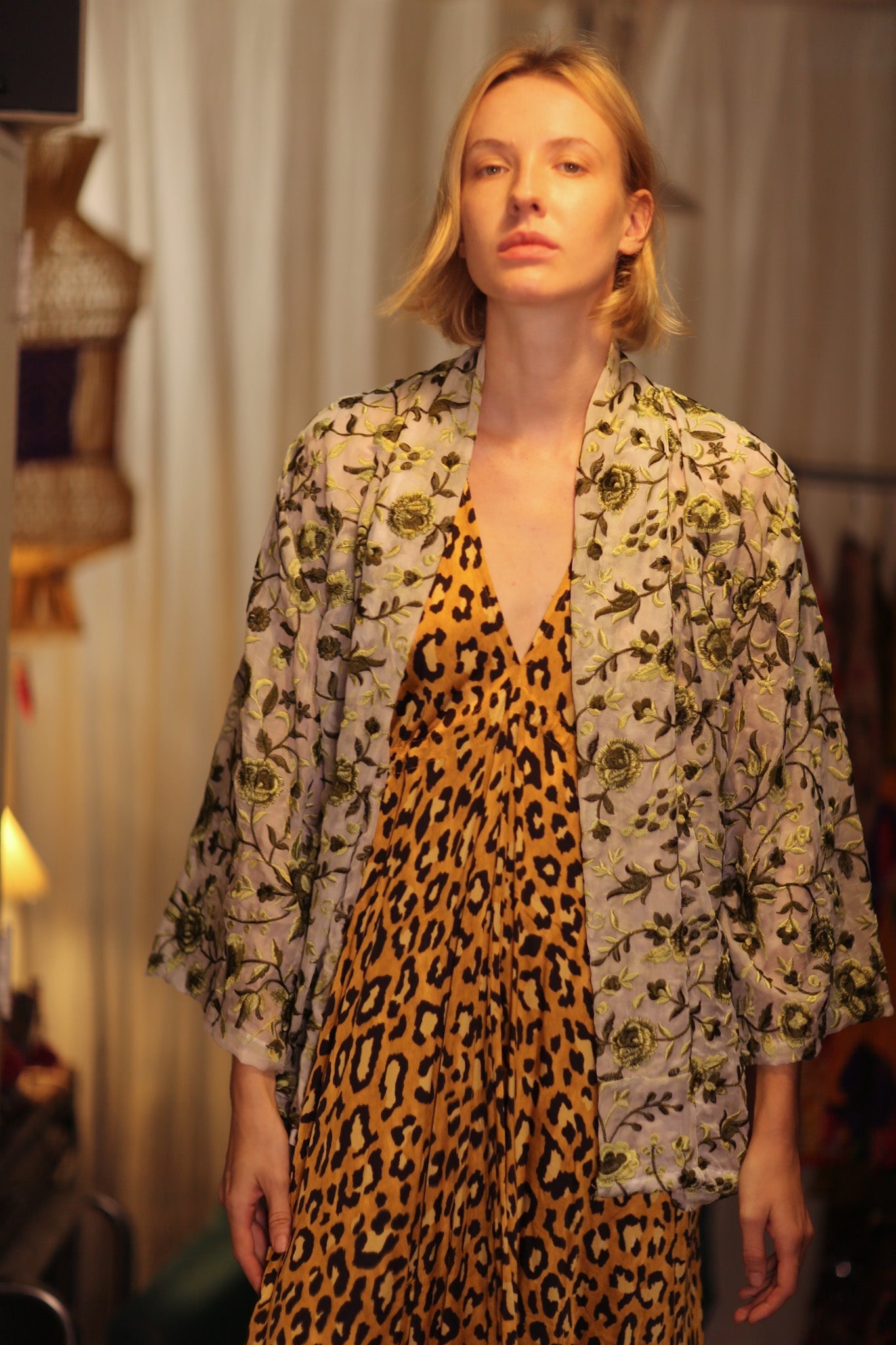 MINTY EMBROIDERED SHORT KIMONO GREEN BOUQUET